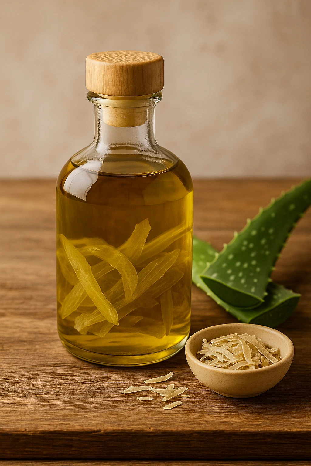 Este es mi favorito porque el aroma queda más redondo. Llena el frasco con el aloe seco y vierte encima el aceite portador hasta cubrirlo por completo. Cierra el frasco y guárdalo en un lugar cálido, sin luz directa. Agítalo cada pocos días. Notarás que el aceite cambia ligeramente de color a medida que pasa el tiempo.