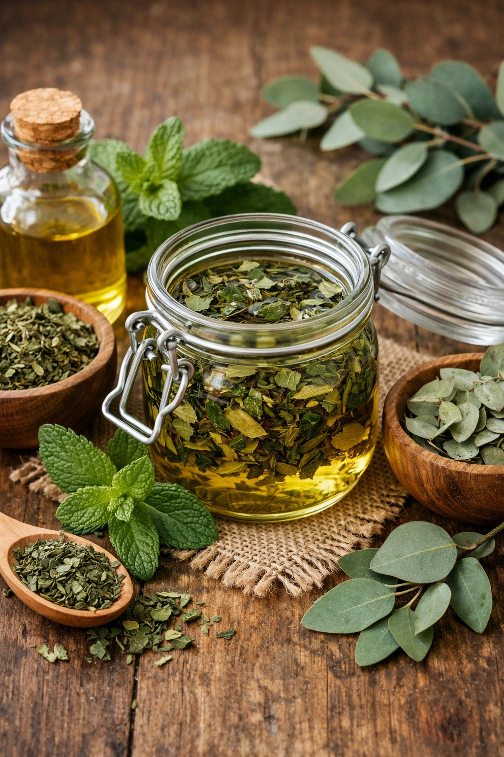 Aquí es donde el proceso se vuelve realmente relajante. Coloca primero la menta y el eucalipto dentro del frasco, vierte el aceite elegido hasta cubrirlas completamente y mezcla suavemente para evitar burbujas. El contacto total entre aceite y hojas es clave para una buena infusión. Desde aquí tienes dos caminos, y ambos funcionan muy bien dependiendo del tiempo que tengas.