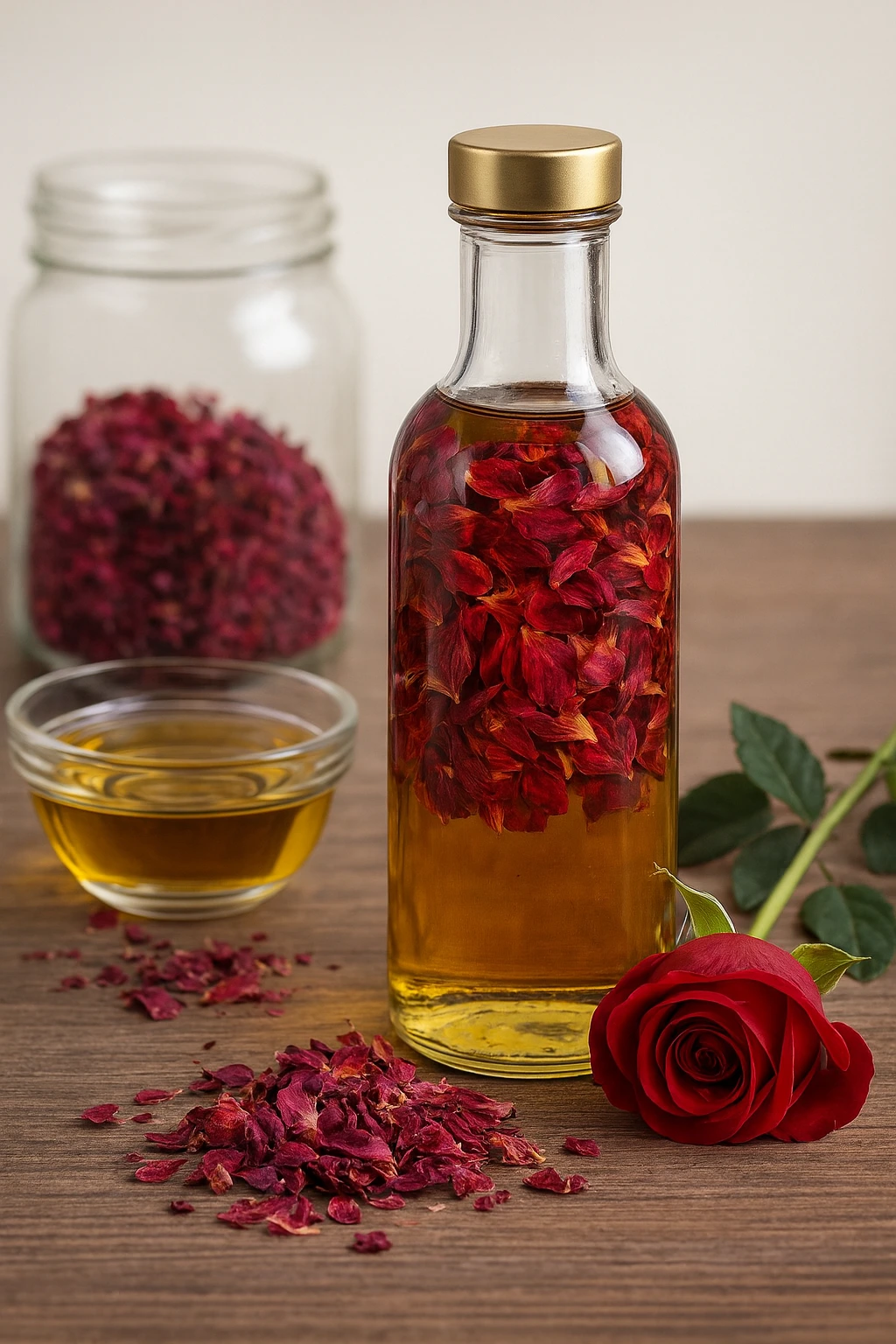 Es importante que los pétalos estén completamente secos. Si queda humedad, puedes arruinar la mezcla o acortar su vida útil. Te recomiendo usar pétalos rojos o rosados porque tienden a conservar mejor su aroma. En cuanto al aceite portador, cualquiera de los siguientes funciona bien:
