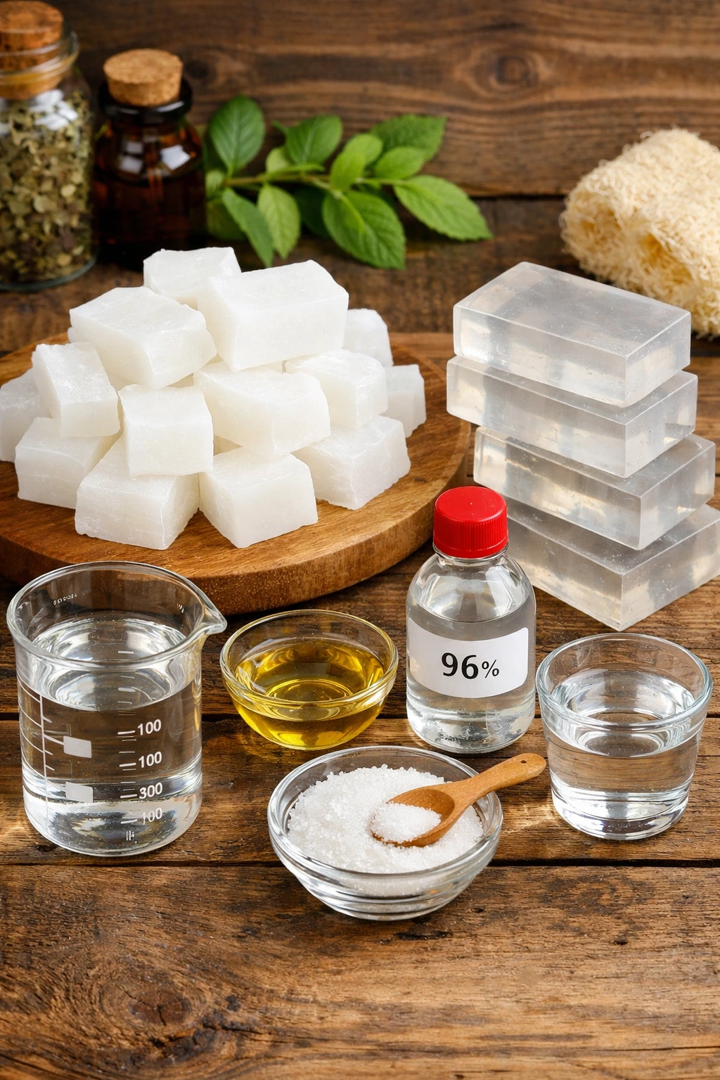La base blanca es el soporte principal. La glicerina líquida aporta suavidad y ayuda a que el jabón no reseque la piel. El azúcar, bien disuelto, mejora la claridad. El alcohol se usa en poca cantidad y se evapora rápido, pero marca la diferencia en la transparencia final. El agua destilada solo sirve para disolver el azúcar sin contaminar la mezcla.