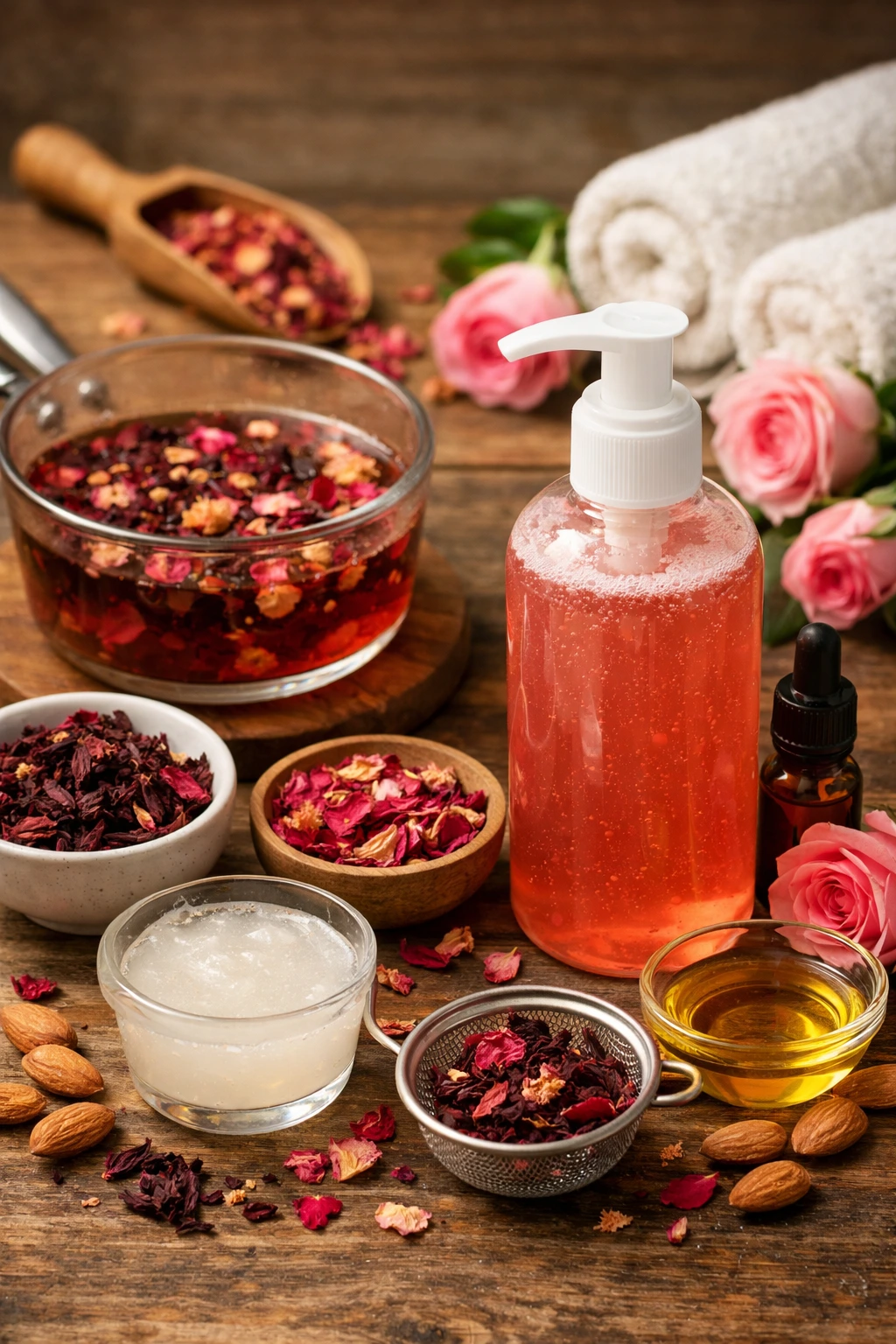 Siempre me sorprende cómo ingredientes tan simples pueden marcar una diferencia real. El hibisco es conocido por aportar brillo y vitalidad, mientras que la rosa deja una suavidad muy agradable al tacto. Cuando los combinas, notas un cambio sutil pero constante: el cabello se siente más ligero, más vivo. Tú mismo lo notarás desde los primeros usos, sobre todo si tu cabello está seco o apagado.