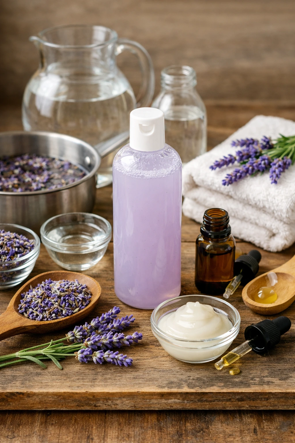 El agua es la base de nuestra infusión. Las flores secas de lavanda son el corazón de la receta, aportando aroma y propiedades calmantes. La base de champú neutro permite limpiar suavemente sin irritar. La glicerina vegetal ayuda a mantener la hidratación y aporta una textura ligeramente más sedosa. El aceite esencial es opcional, pero intensifica el aroma y refuerza la sensación relajante.