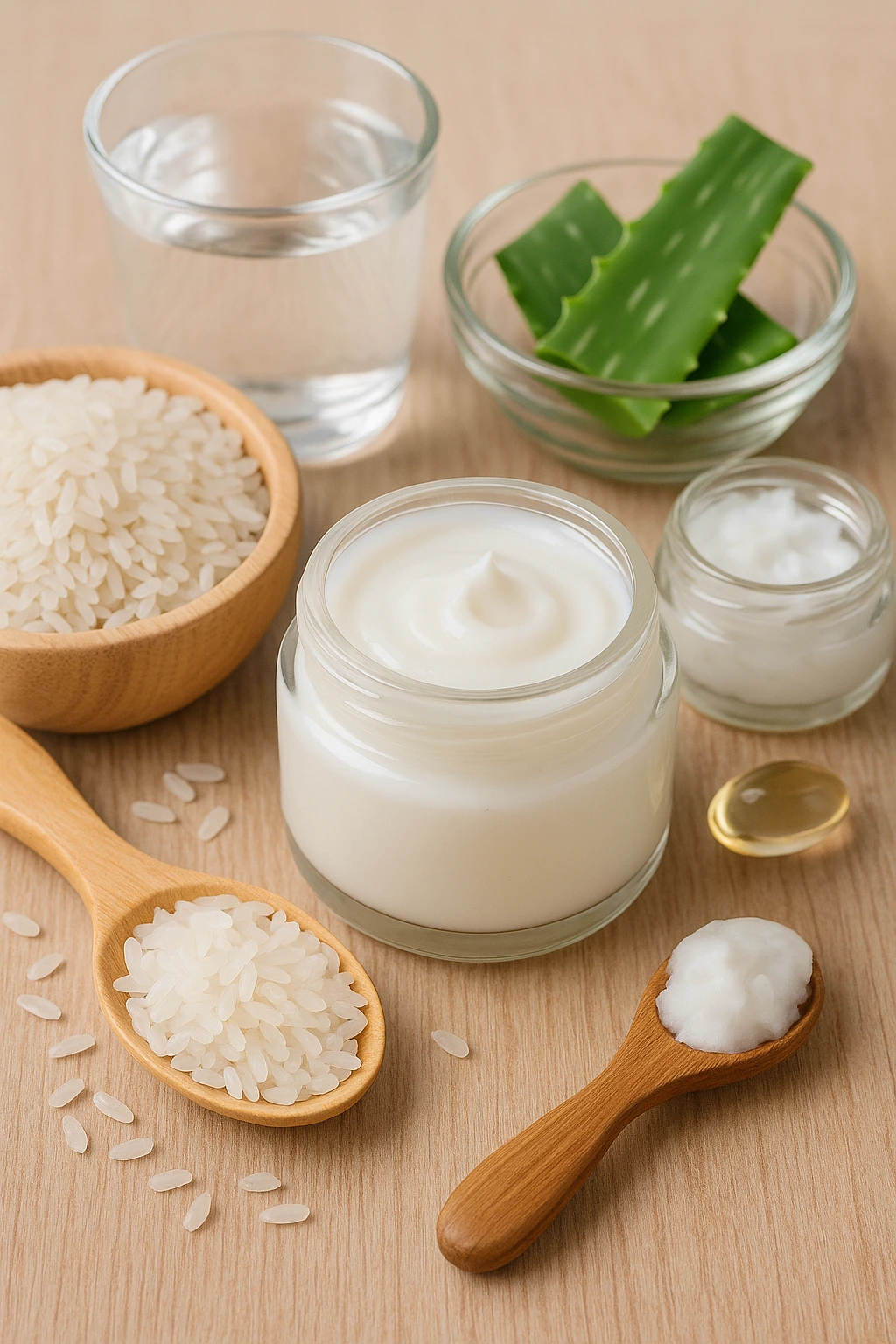 Cada ingrediente tiene un propósito muy claro. El arroz es la base, rico en almidón y perfecto para suavizar la piel. El aloe vera aporta frescura y ayuda a calmar irritaciones. La vitamina E actúa como antioxidante y mejora la duración de la crema. El aceite de coco añade una hidratación ligera y hace que la mezcla se deslice mejor sobre la piel. Si eliges ingredientes de buena calidad, notarás que la textura final mejora muchísimo.