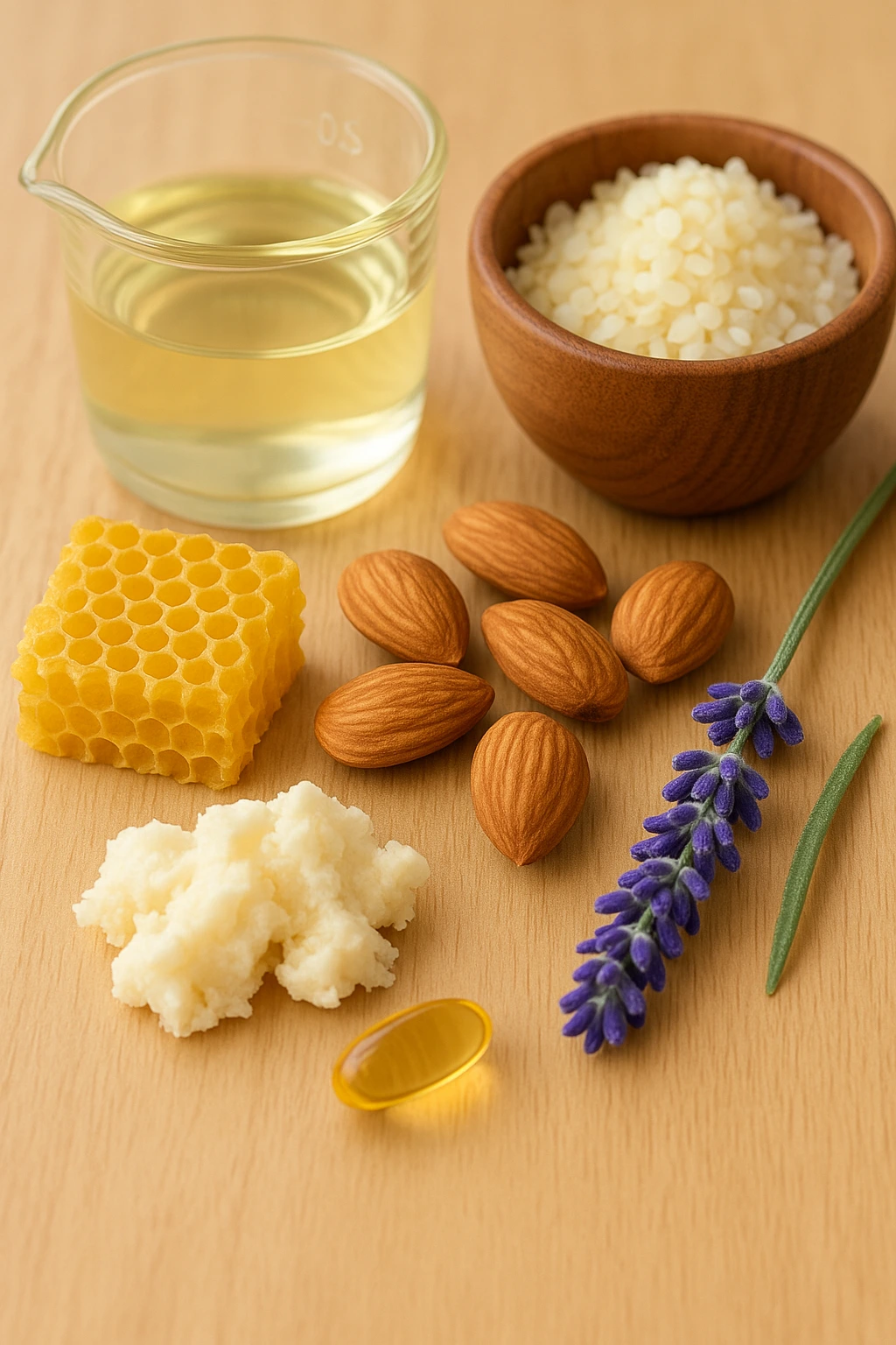 La cera de abeja es la estructura del bálsamo. Le da firmeza y crea esa capa protectora que se nota al aplicar. El aceite de almendras dulces aporta suavidad sin sensación pesada, mientras que la manteca de karité añade un extra nutritivo que se agradece especialmente por la noche. La lavanda no solo perfuma, también calma la piel, y la vitamina E ayuda tanto a la piel como a la conservación del producto.