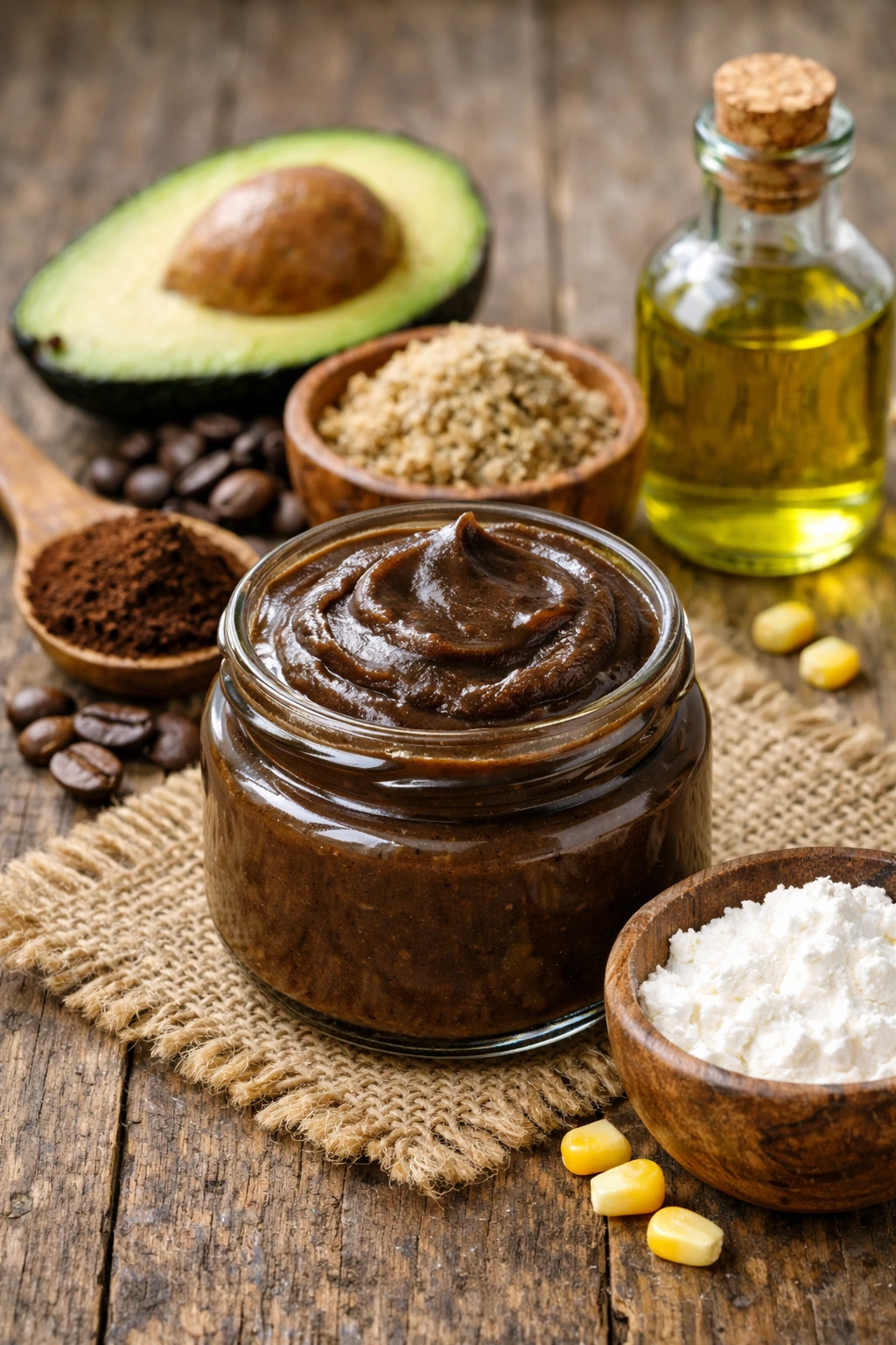 El café aporta pigmento oscuro y revitaliza el color apagado. La pepa de aguacate fortalece la fibra capilar y ayuda a oscurecer de forma progresiva. La maicena da cuerpo y suavidad a la crema, mientras que el aceite de oliva sella, nutre y deja un brillo visible desde la primera aplicación.