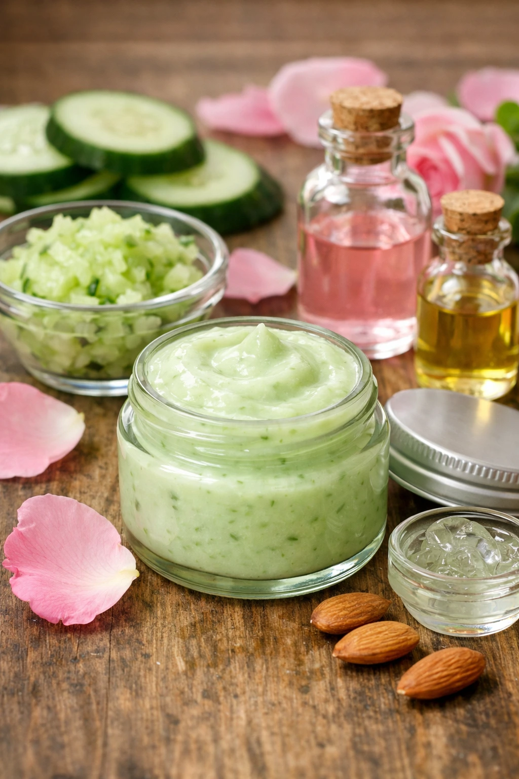 El pepino es conocido por su alto contenido de agua y por su sensación calmante sobre la piel. Al triturarlo, libera un jugo fresco que ayuda a hidratar y aliviar la piel cansada. Cada vez que preparo esta crema, noto ese aroma limpio y suave que recuerda a los tratamientos naturales de spa.