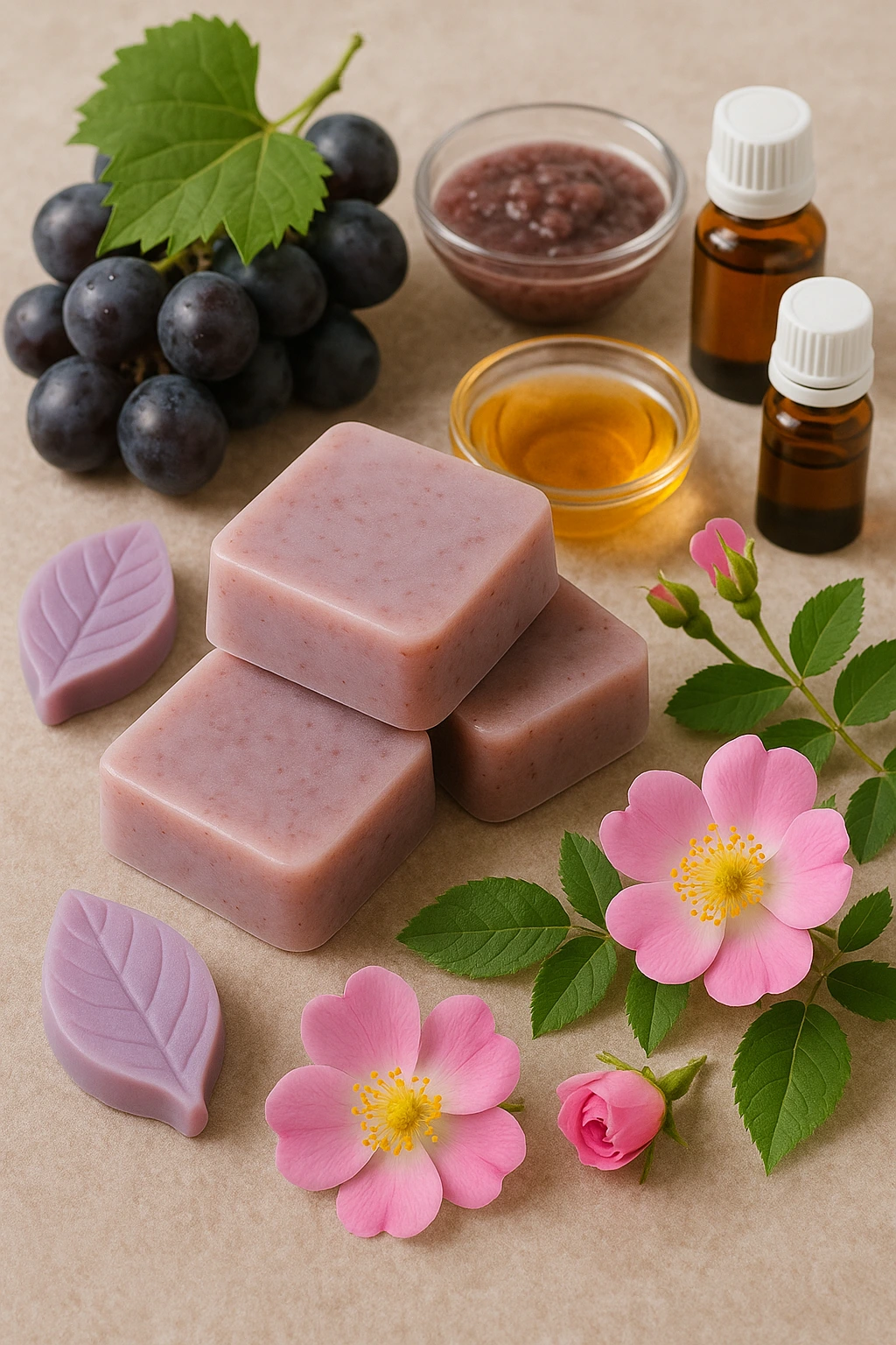 Para obtener un jabón de calidad, es importante seleccionar ingredientes frescos y bien conservados. La base de glicerina blanca es la más fácil de trabajar y permite que el color de las uvas se mantenga suave y natural. El puré de uvas moradas debe estar bien triturado para evitar grumos. La rosa mosqueta conviene comprarla en aceite puro, preferentemente prensado en frío, para aprovechar al máximo sus propiedades. Si puedes elegir aceites esenciales de buena calidad, notarás un aroma mucho más limpio y duradero.