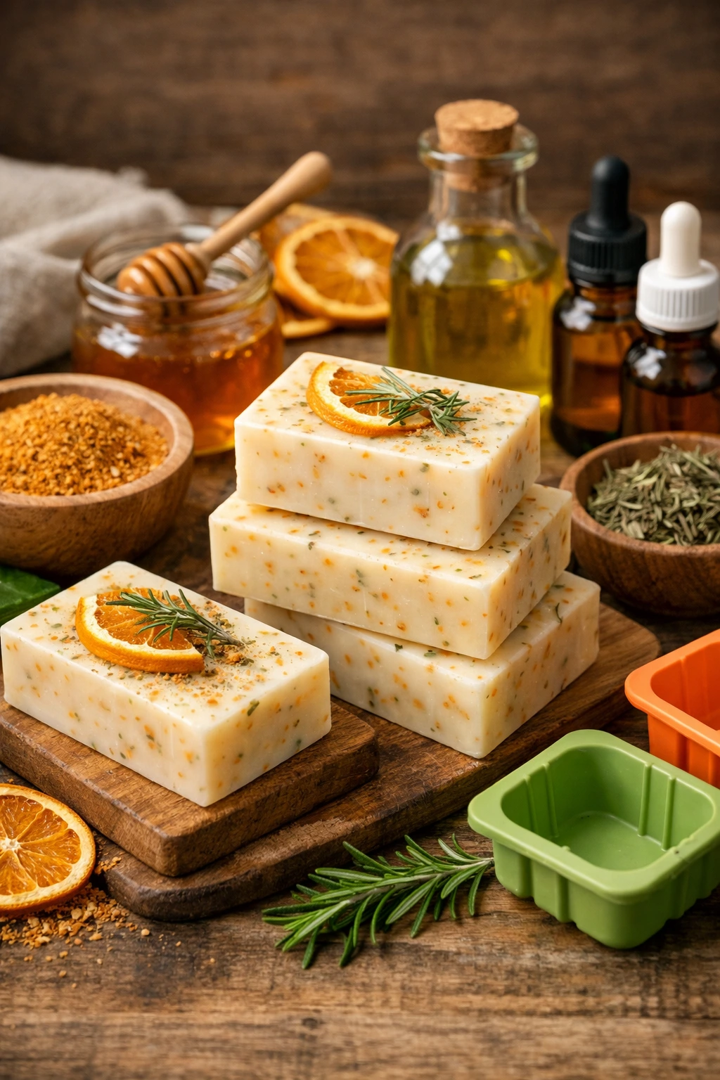 Vale la pena elegir una base de glicerina confiable, limpia y de buena procedencia. Yo prefiero la base blanca porque resalta mejor el color del romero y de la naranja. En cuanto al aceite de oliva, uno virgen extra aporta suavidad y nutrición. La miel es opcional, pero si la usas notarás una espuma algo más sedosa. Y algo importante: asegúrate de que la naranja y el romero estén realmente secos, sin humedad, porque eso marca la diferencia en la conservación y en el acabado final.