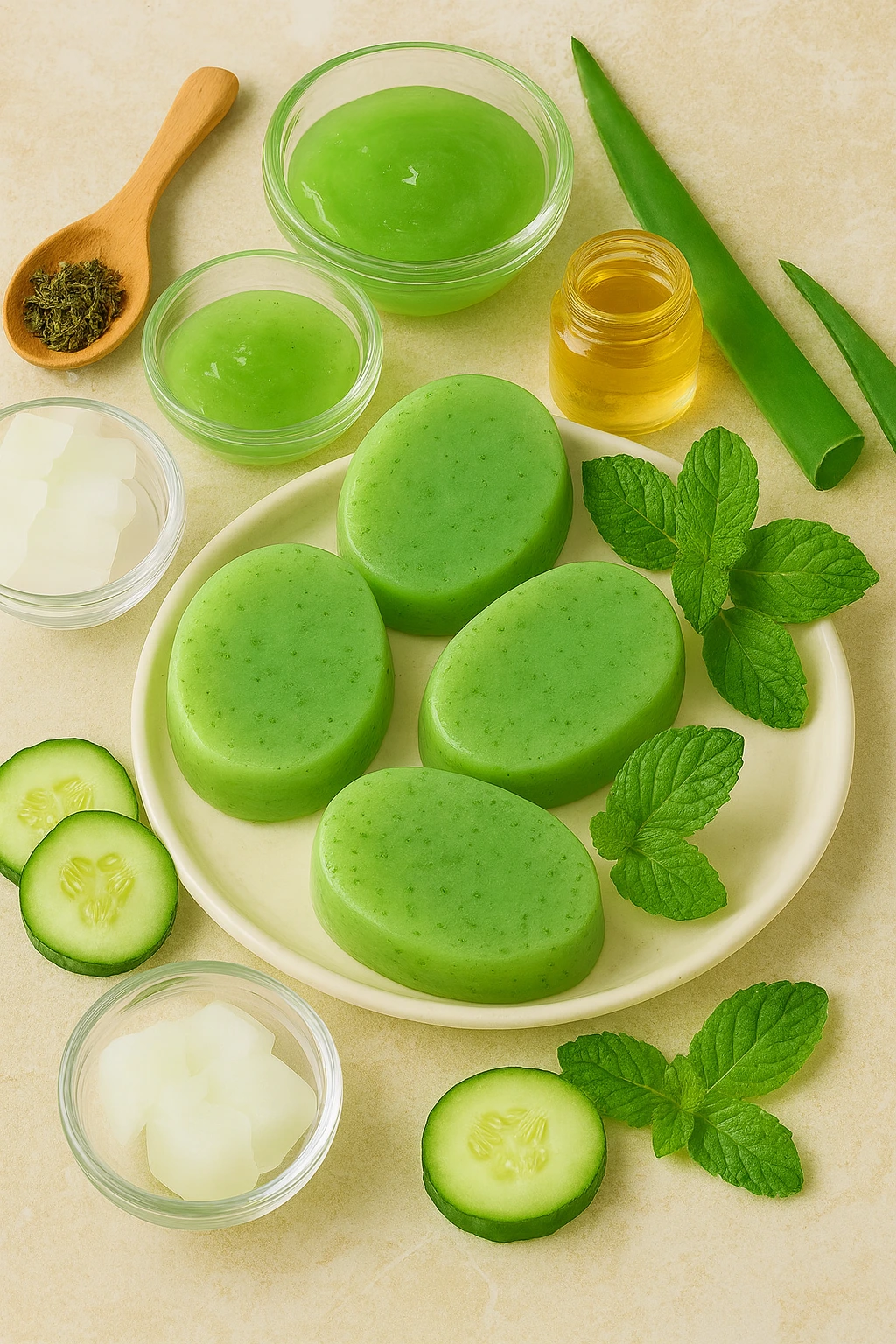 Siempre me ha gustado trabajar con ingredientes que se sienten vivos, frescos y ligeros en la piel. Este jabón de té verde, pepino y aloe tiene justamente esa personalidad: limpia sin irritar, deja una sensación fría y calmante, y aporta un aroma vegetal que notas apenas lo sacas del molde. La mezcla nació de intentar crear un jabón que ayudara después de días largos o calurosos, cuando la piel necesita algo más que una limpieza rápida. Aquí, cada elemento aporta algo: el té verde refresca y revitaliza, el pepino da suavidad y el aloe ayuda a mantener la hidratación natural.