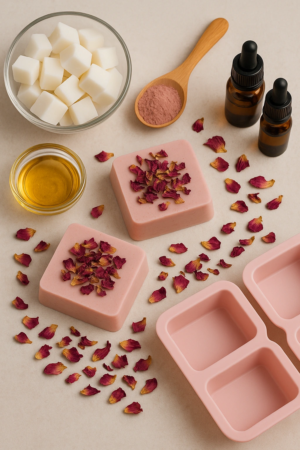 Añade pétalos secos solo cuando el jabón esté ligeramente espeso; así no se hunden tanto. Deja reposar sin mover durante 3 o 4 horas. Si esperas un poco más, mejor aún. Saber que están listos es fácil: la superficie pierde brillo y se vuelve más firme al tacto.