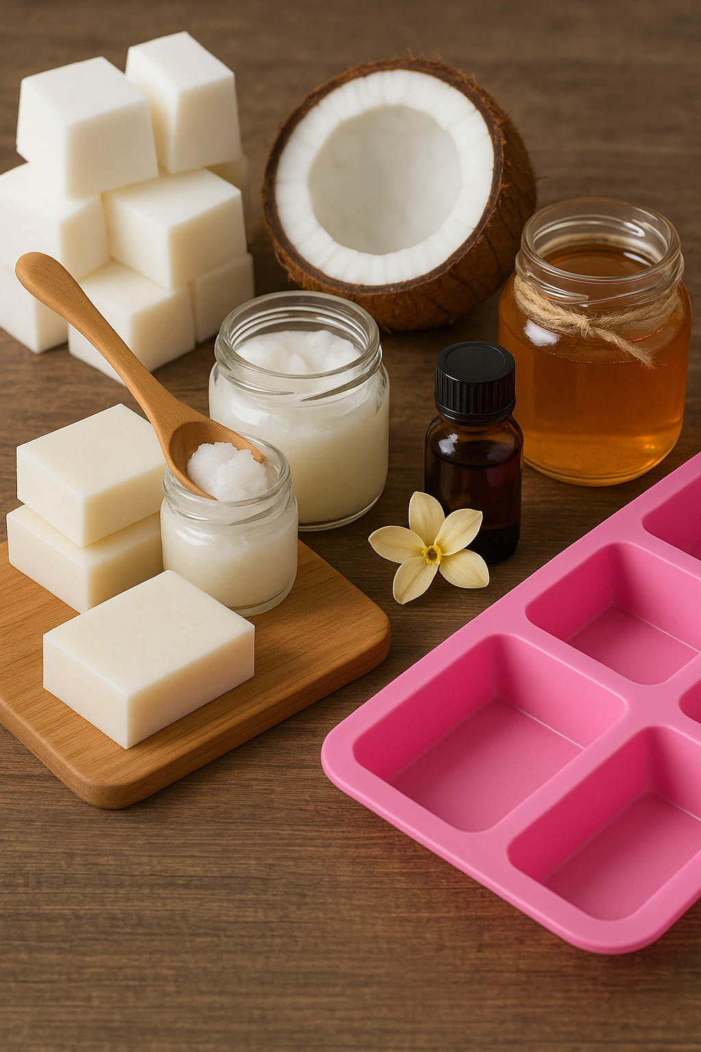 El aceite de coco es la estrella de esta receta. Es conocido por su alto contenido de ácidos grasos que nutren e hidratan la piel en profundidad. Cuando lo añades al jabón, aporta una espuma cremosa y deja una sensación sedosa al tacto. Personalmente, me gusta usar aceite de coco virgen extra, porque conserva mejor sus propiedades naturales y su delicado aroma tropical.