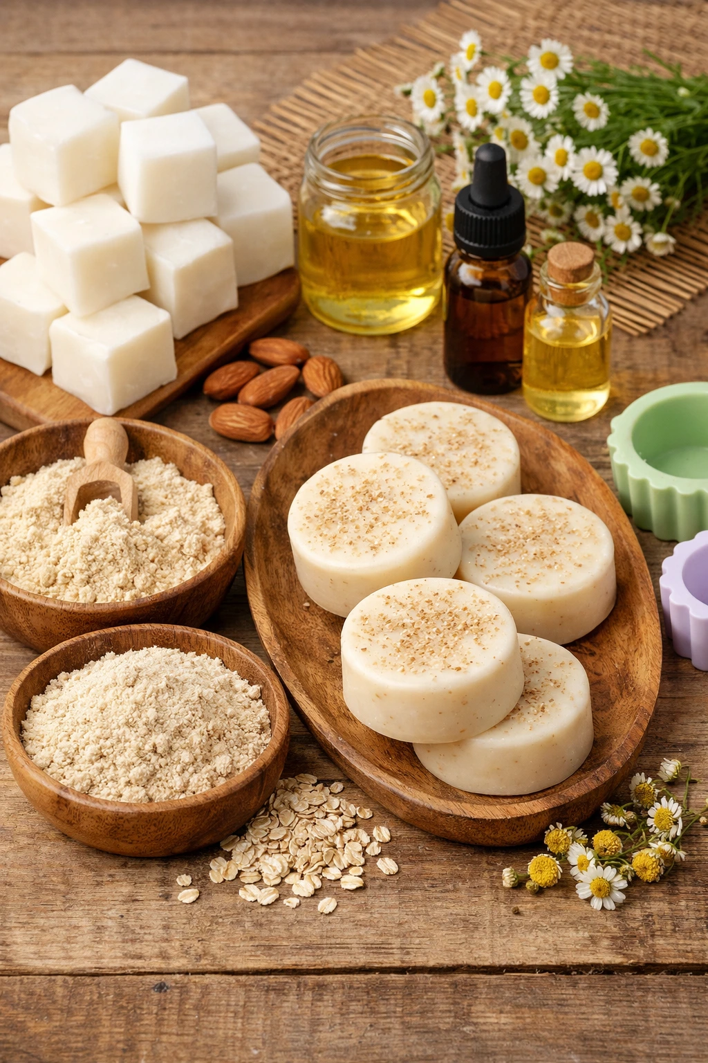 Aquí conviene no improvisar demasiado. Usar solo una cucharada de cada polvo es clave para evitar una pastilla arenosa. Si te pasas con la harina o la avena, el jabón puede quedar frágil o con grumos. Yo siempre tamizo los polvos antes de añadirlos y eso marca una gran diferencia en el acabado final.