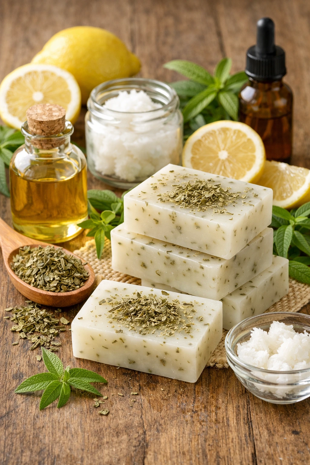 Aquí es donde realmente se marca la diferencia. Yo siempre recomiendo usar una hierba luisa que tenga buen aroma incluso antes de usarla. Si la hueles y ya se siente fresca, vas por buen camino. En cuanto a los aceites, busca que sean lo más naturales posible. El aceite de almendras aporta suavidad, mientras que el de coco añade esa sensación cremosa al tacto. Cuando eliges bien, el resultado se nota en la textura final del jabón y en cómo se siente sobre la piel.