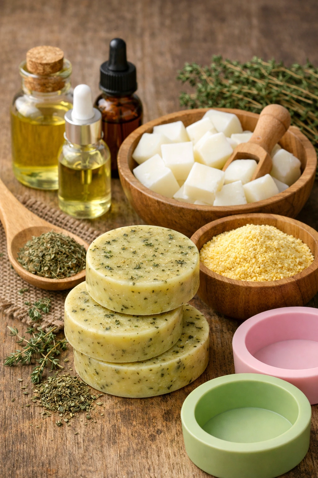 La base de glicerina aporta transparencia suave y una espuma cremosa. El tomillo añade carácter y una ligera sensación purificante. La harina de maíz se siente casi imperceptible al tacto, pero deja la piel notablemente más suave.
