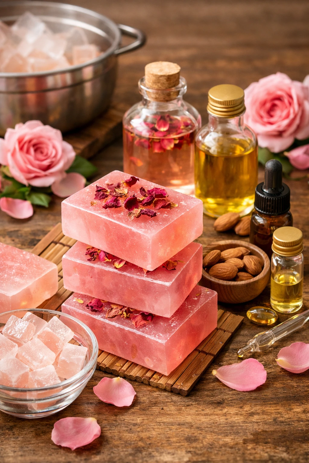 El aceite de rosa aporta ese carácter rejuvenecedor que buscamos, mientras que el aceite de almendras dulces añade nutrición y elasticidad. Si decides incluir vitamina E, notarás que el jabón se siente aún más protector, sobre todo en pieles secas.