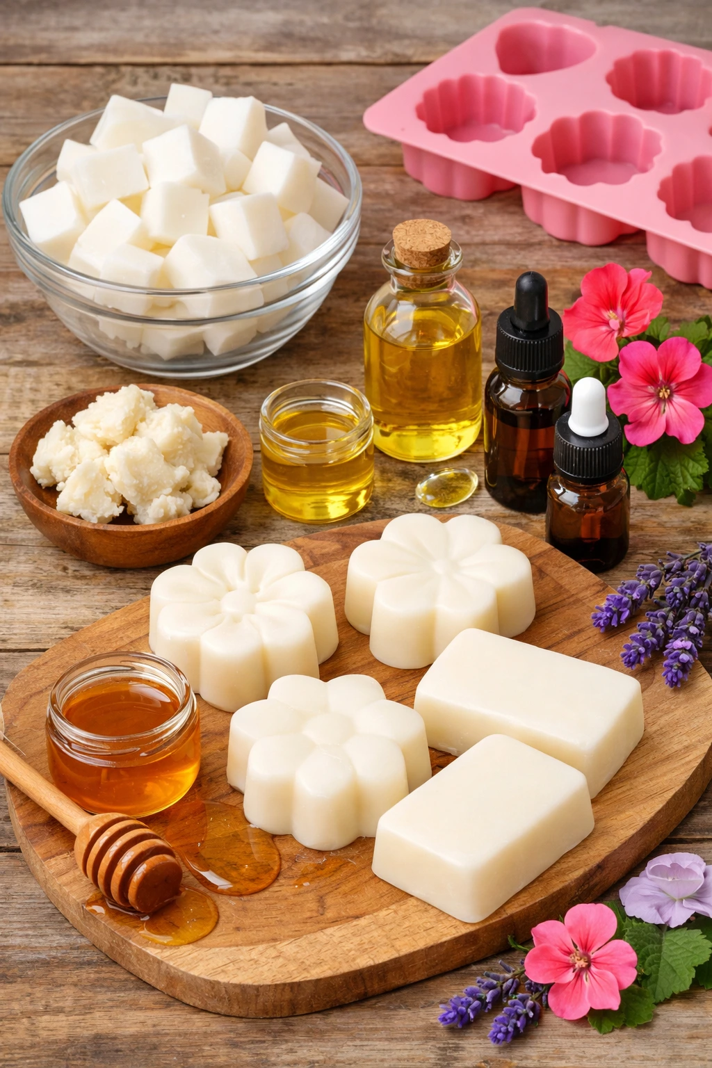 Empieza fundiendo la base de glicerina lentamente. Puedes usar baño maría o microondas en intervalos cortos, siempre removiendo entre pausas para evitar que hierva. Cuando esté completamente líquida, añade la manteca de karité y mezcla hasta que se integre por completo. Luego incorpora el aceite de jojoba, la vitamina E y la miel. Mezcla con suavidad, sin batir demasiado, para no generar burbujas. Agrega los aceites esenciales y vuelve a integrar. Vierte la mezcla en los moldes de silicona y deja reposar de 3 a 4 horas, hasta que solidifique bien. Desmolda con calma y ya tendrás un jabón hermoso, firme y cremoso.
