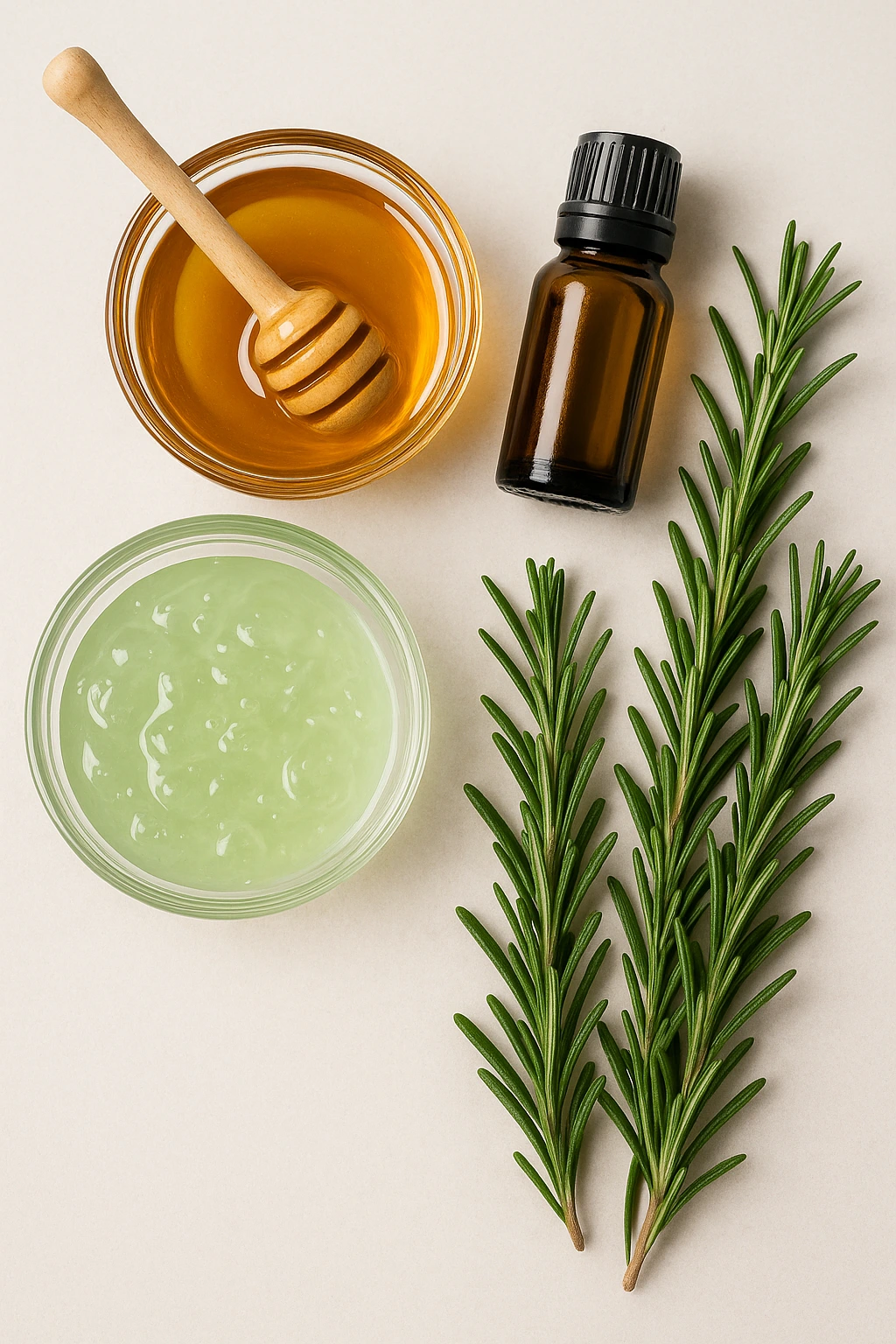 Elegí estos ingredientes porque trabajan en sinergia. El aloe suaviza y calma, algo ideal si el cuero cabelludo está irritado. La miel aporta cuerpo sin dejar sensación pegajosa una vez que se mezcla bien con el aloe. Y el aceite de romero añade ese impulso estimulante que tanto ayuda con la caída. Las gotas opcionales de aceite esencial intensifican el aroma herbal y potencian el efecto tonificante, pero no son necesarias para que funcione.