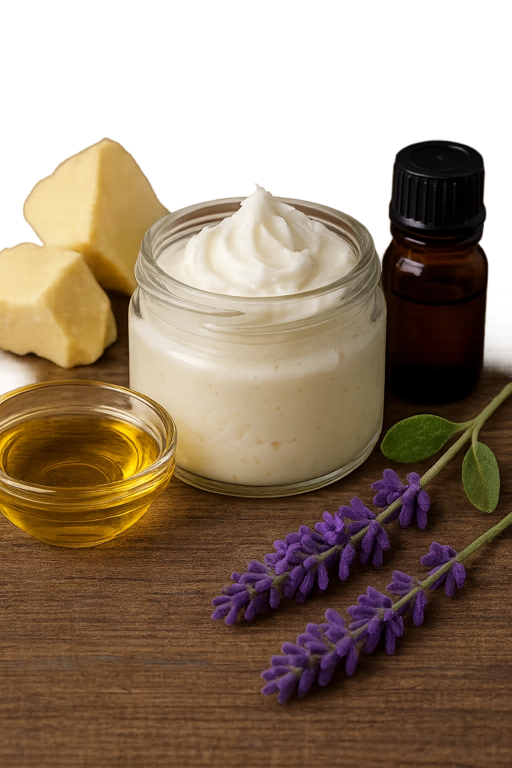 Cada ingrediente desempeña un papel esencial. La manteca de cacao aporta una textura sedosa y un aroma cálido, ligeramente achocolatado. El aceite de almendras dulces se absorbe rápido y deja la piel con un brillo natural, nunca grasosa. Y el aceite esencial de lavanda… bueno, ese es el alma de la receta. Apenas lo agregas, la mezcla desprende un aroma floral que invita a respirar más lento y profundo.